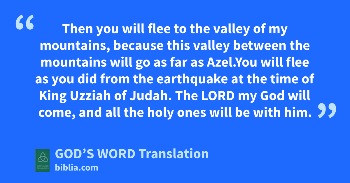 3 Then the Lord will go out and fight against those nations as he does when he fights a battle. 4 On that day his feet will stand on the Mount of Olives, just east of Jerusalem. The Mount of Olives will be split in two, forming a very large valley from east to west. Half of the mountain will move toward the north, and the other half will move toward the south. 5 Then you will flee to the valley of my mountains, because this valley between the mountains will go as far as Azel. You will flee as you did from the earthquake at the time of King Uzziah of Judah. The Lord my God will come, and all the holy ones will be with him.