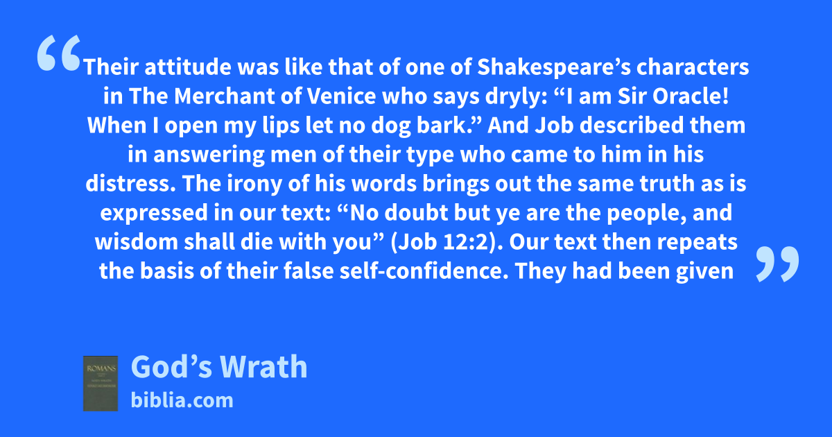 Their attitude was like that of one of Shakespeare’s characters in The Merchant of Venice who says dryly: “I am Sir Oracle! When I open my lips let no dog bark.” And Job described them in answering men of their type who came to him in his distress. The irony of his words brings out the same truth as is expressed in our text: “No doubt but ye are the people, and wisdom shall die with you” (Job 12:2). Our text then repeats the basis of their false self-confidence. They had been given
