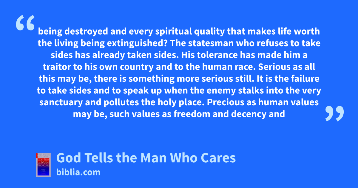 being destroyed and every spiritual quality that makes life worth the living being extinguished? The statesman who refuses to take sides has already taken sides. His tolerance has made him a traitor to his own country and to the human race. Serious as all this may be, there is something more serious still. It is the failure to take sides and to speak up when the enemy stalks into the very sanctuary and pollutes the holy place. Precious as human values may be, such values as freedom and decency and