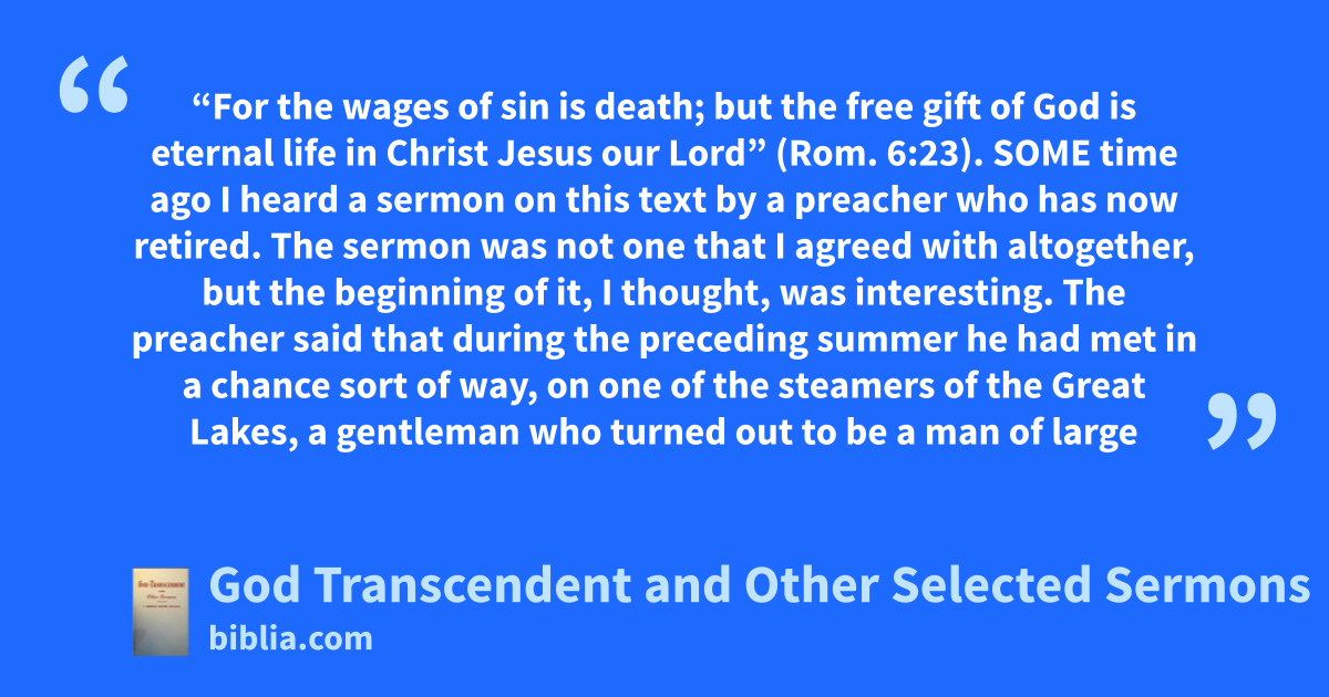 “For the wages of sin is death; but the free gift of God is eternal life in Christ Jesus our Lord” (Rom. 6:23). SOME time ago I heard a sermon on this text by a preacher who has now retired. The sermon was not one that I agreed with altogether, but the beginning of it, I thought, was interesting. The preacher said that during the preceding summer he had met in a chance sort of way, on one of the steamers of the Great Lakes, a gentleman who turned out to be a man of large