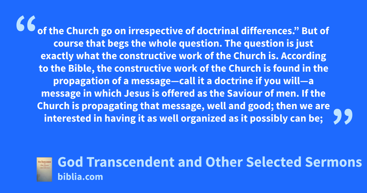 of the Church go on irrespective of doctrinal differences.” But of course that begs the whole question. The question is just exactly what the constructive work of the Church is. According to the Bible, the constructive work of the Church is found in the propagation of a message—call it a doctrine if you will—a message in which Jesus is offered as the Saviour of men. If the Church is propagating that message, well and good; then we are interested in having it as well organized as it possibly can be;