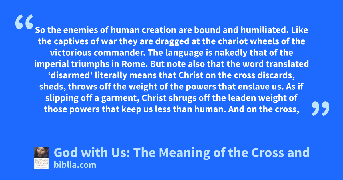 So the enemies of human creation are bound and humiliated. Like the captives of war they are dragged at the chariot wheels of the victorious commander. The language is nakedly that of the imperial triumphs in Rome. But note also that the word translated ‘disarmed’ literally means that Christ on the cross discards, sheds, throws off the weight of the powers that enslave us. As if slipping off a garment, Christ shrugs off the leaden weight of those powers that keep us less than human. And on the cross,