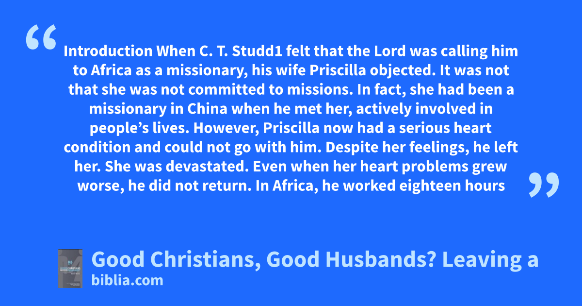 Introduction When C. T. Studd1 felt that the Lord was calling him to Africa as a missionary, his wife Priscilla objected. It was not that she was not committed to missions. In fact, she had been a missionary in China when he met her, actively involved in people’s lives. However, Priscilla now had a serious heart condition and could not go with him. Despite her feelings, he left her. She was devastated. Even when her heart problems grew worse, he did not return. In Africa, he worked eighteen hours