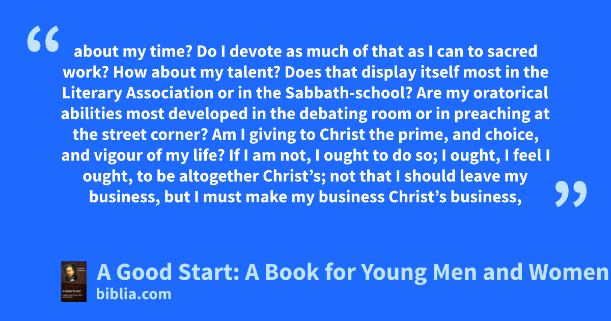 about my time? Do I devote as much of that as I can to sacred work? How about my talent? Does that display itself most in the Literary Association or in the Sabbath-school? Are my oratorical abilities most developed in the debating room or in preaching at the street corner? Am I giving to Christ the prime, and choice, and vigour of my life? If I am not, I ought to do so; I ought, I feel I ought, to be altogether Christ’s; not that I should leave my business, but I must make my business Christ’s business,
