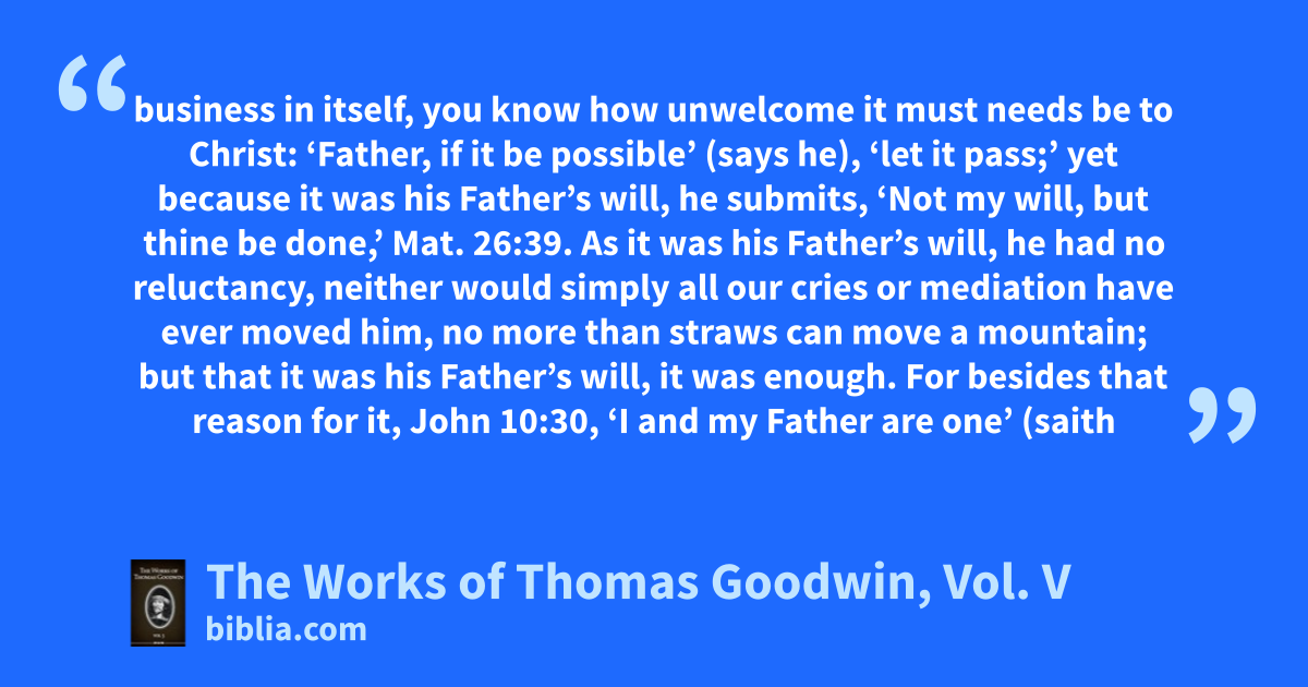 business in itself, you know how unwelcome it must needs be to Christ: ‘Father, if it be possible’ (says he), ‘let it pass;’ yet because it was his Father’s will, he submits, ‘Not my will, but thine be done,’ Mat. 26:39. As it was his Father’s will, he had no reluctancy, neither would simply all our cries or mediation have ever moved him, no more than straws can move a mountain; but that it was his Father’s will, it was enough. For besides that reason for it, John 10:30, ‘I and my Father are one’ (saith