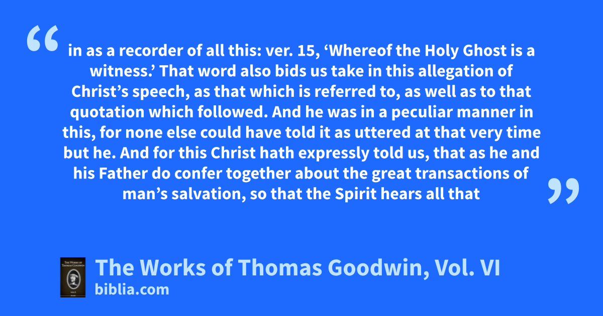 in as a recorder of all this: ver. 15, ‘Whereof the Holy Ghost is a witness.’ That word also bids us take in this allegation of Christ’s speech, as that which is referred to, as well as to that quotation which followed. And he was in a peculiar manner in this, for none else could have told it as uttered at that very time but he. And for this Christ hath expressly told us, that as he and his Father do confer together about the great transactions of man’s salvation, so that the Spirit hears all that