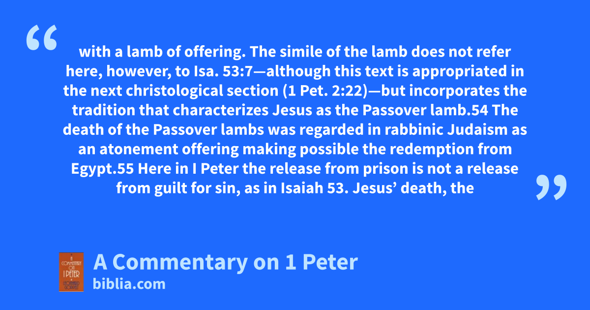 with a lamb of offering. The simile of the lamb does not refer here, however, to Isa. 53:7—although this text is appropriated in the next christological section (1 Pet. 2:22)—but incorporates the tradition that characterizes Jesus as the Passover lamb.54 The death of the Passover lambs was regarded in rabbinic Judaism as an atonement offering making possible the redemption from Egypt.55 Here in I Peter the release from prison is not a release from guilt for sin, as in Isaiah 53. Jesus’ death, the
