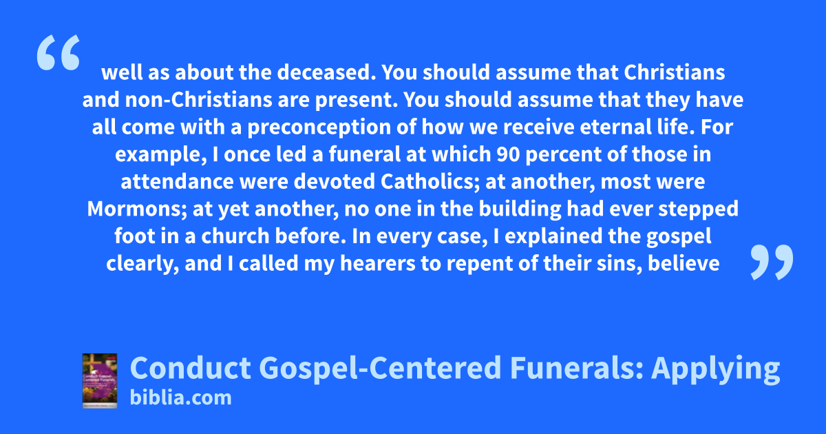well as about the deceased. You should assume that Christians and non-Christians are present. You should assume that they have all come with a preconception of how we receive eternal life. For example, I once led a funeral at which 90 percent of those in attendance were devoted Catholics; at another, most were Mormons; at yet another, no one in the building had ever stepped foot in a church before. In every case, I explained the gospel clearly, and I called my hearers to repent of their sins, believe