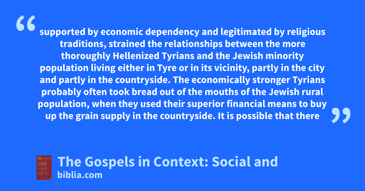 supported by economic dependency and legitimated by religious traditions, strained the relationships between the more thoroughly Hellenized Tyrians and the Jewish minority population living either in Tyre or in its vicinity, partly in the city and partly in the countryside. The economically stronger Tyrians probably often took bread out of the mouths of the Jewish rural population, when they used their superior financial means to buy up the grain supply in the countryside. It is possible that there