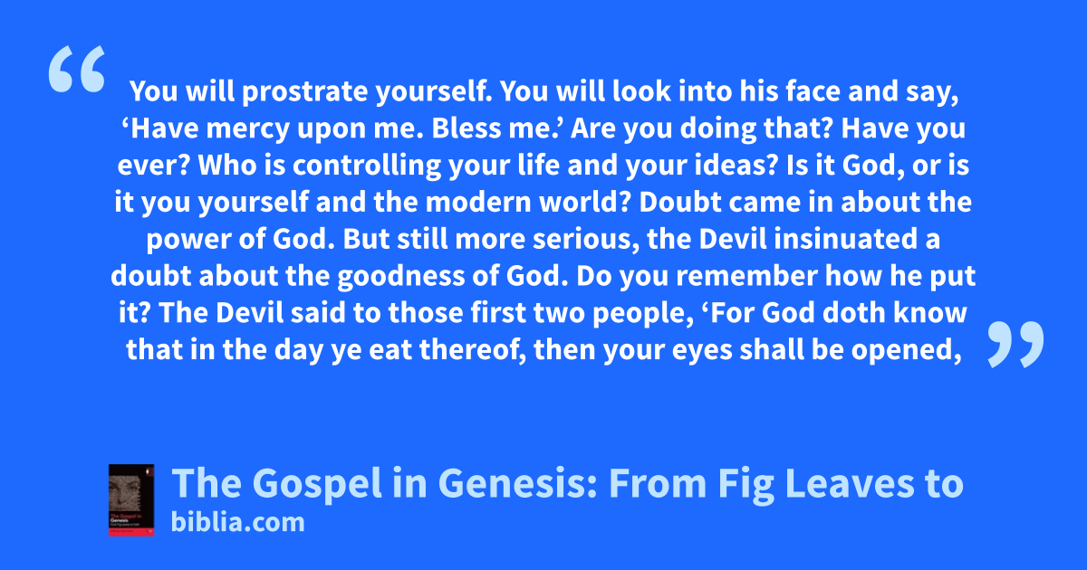 You will prostrate yourself. You will look into his face and say, ‘Have mercy upon me. Bless me.’ Are you doing that? Have you ever? Who is controlling your life and your ideas? Is it God, or is it you yourself and the modern world? Doubt came in about the power of God. But still more serious, the Devil insinuated a doubt about the goodness of God. Do you remember how he put it? The Devil said to those first two people, ‘For God doth know that in the day ye eat thereof, then your eyes shall be opened,