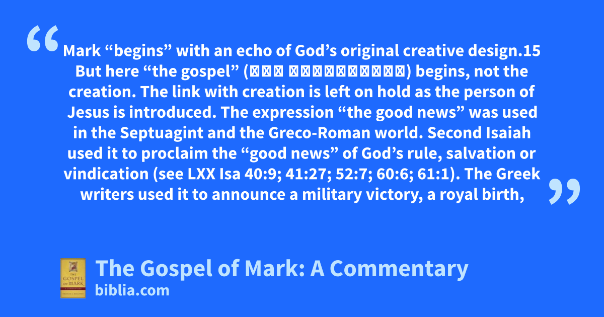 Mark “begins” with an echo of God’s original creative design.15 But here “the gospel” (τοῦ εὐαγγελίου) begins, not the creation. The link with creation is left on hold as the person of Jesus is introduced. The expression “the good news” was used in the Septuagint and the Greco-Roman world. Second Isaiah used it to proclaim the “good news” of God’s rule, salvation or vindication (see LXX Isa 40:9; 41:27; 52:7; 60:6; 61:1). The Greek writers used it to announce a military victory, a royal birth,