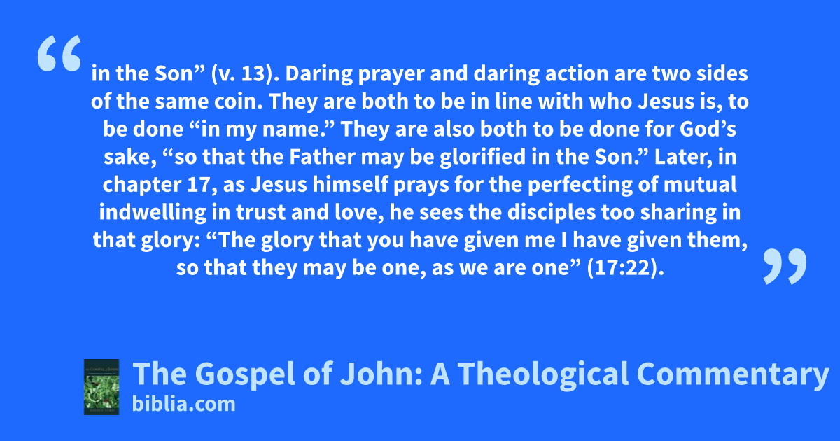 in the Son” (v. 13). Daring prayer and daring action are two sides of the same coin. They are both to be in line with who Jesus is, to be done “in my name.” They are also both to be done for God’s sake, “so that the Father may be glorified in the Son.” Later, in chapter 17, as Jesus himself prays for the perfecting of mutual indwelling in trust and love, he sees the disciples too sharing in that glory: “The glory that you have given me I have given them, so that they may be one, as we are one” (17:22).