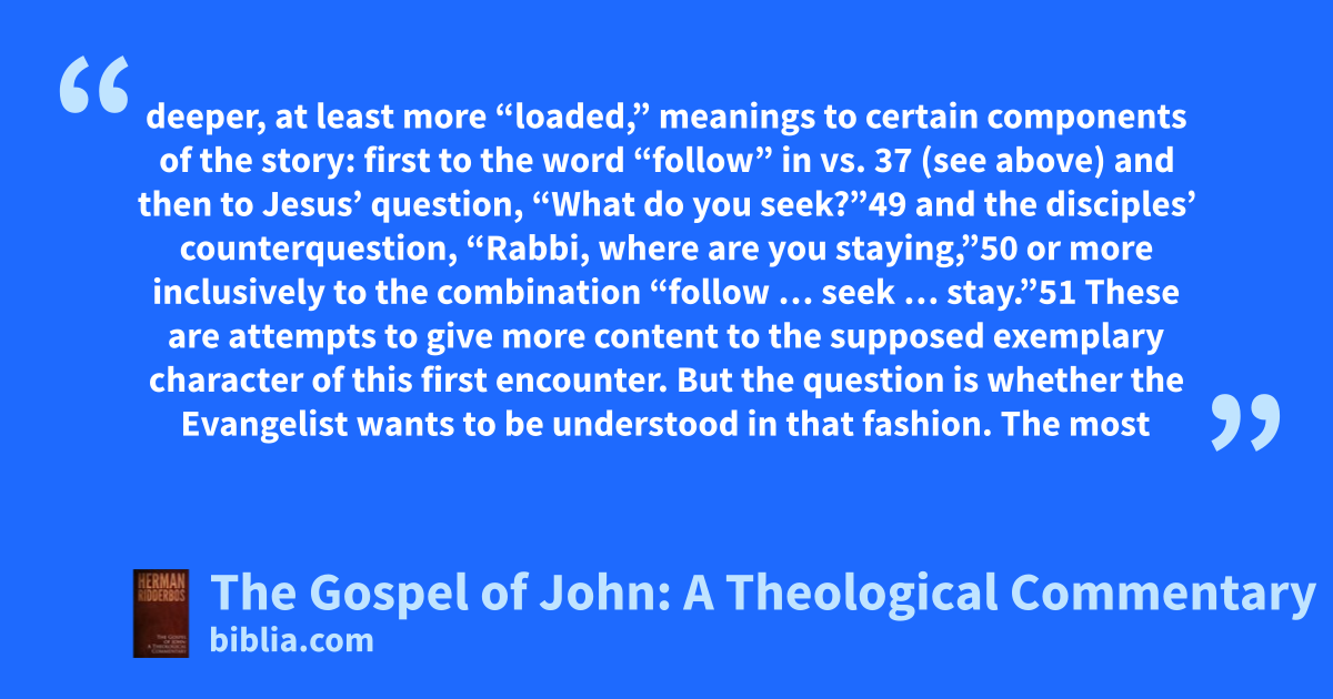 deeper, at least more “loaded,” meanings to certain components of the story: first to the word “follow” in vs. 37 (see above) and then to Jesus’ question, “What do you seek?”49 and the disciples’ counterquestion, “Rabbi, where are you staying,”50 or more inclusively to the combination “follow … seek … stay.”51 These are attempts to give more content to the supposed exemplary character of this first encounter. But the question is whether the Evangelist wants to be understood in that fashion. The most