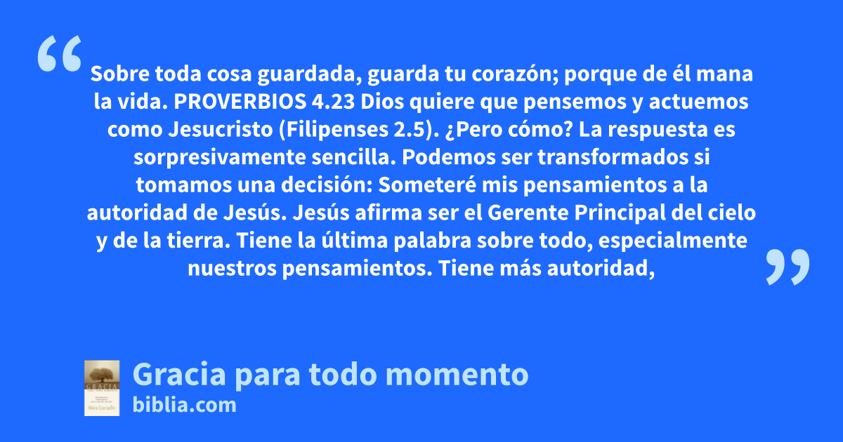 Sobre toda cosa guardada, guarda tu corazón; porque de él mana la vida. PROVERBIOS 4.23 Dios quiere que pensemos y actuemos como Jesucristo (Filipenses 2.5). ¿Pero cómo? La respuesta es sorpresivamente sencilla. Podemos ser transformados si tomamos una decisión: Someteré mis pensamientos a la autoridad de Jesús. Jesús afirma ser el Gerente Principal del cielo y de la tierra. Tiene la última palabra sobre todo, especialmente nuestros pensamientos. Tiene más autoridad,