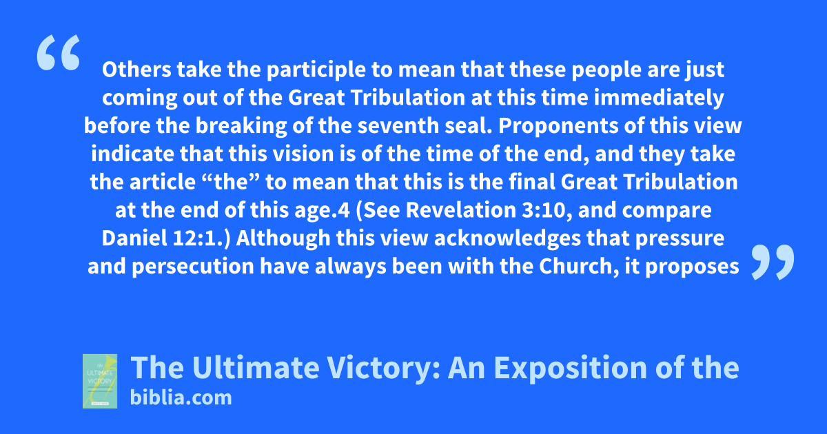 Others take the participle to mean that these people are just coming out of the Great Tribulation at this time immediately before the breaking of the seventh seal. Proponents of this view indicate that this vision is of the time of the end, and they take the article “the” to mean that this is the final Great Tribulation at the end of this age.4 (See Revelation 3:10, and compare Daniel 12:1.) Although this view acknowledges that pressure and persecution have always been with the Church, it proposes
