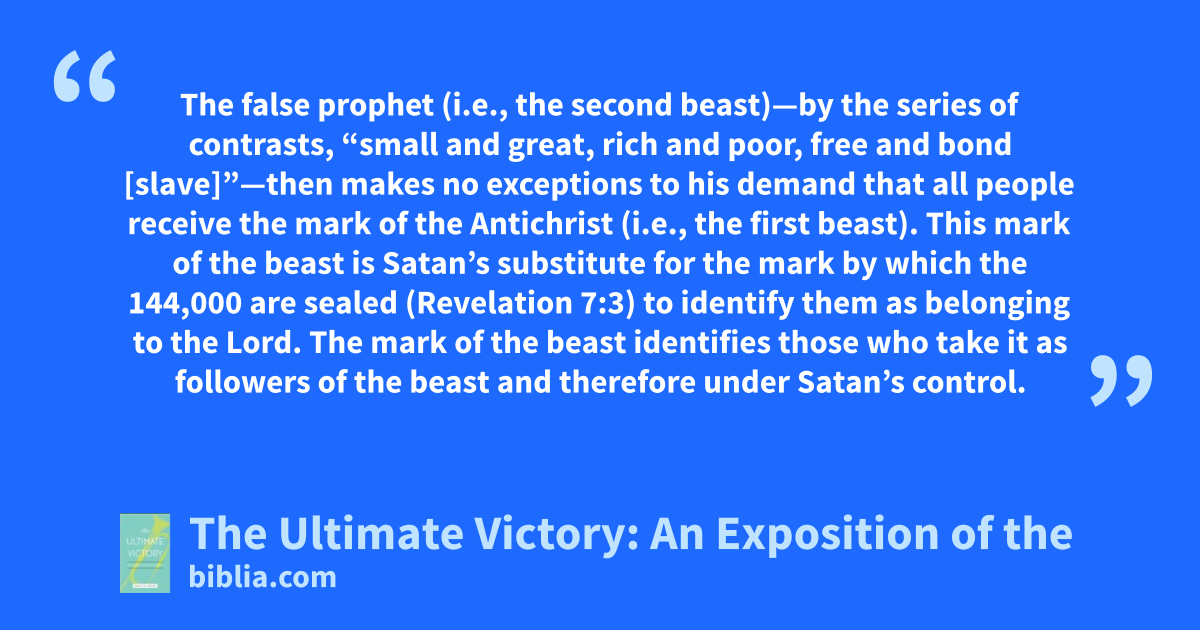 The false prophet (i.e., the second beast)—by the series of contrasts, “small and great, rich and poor, free and bond [slave]”—then makes no exceptions to his demand that all people receive the mark of the Antichrist (i.e., the first beast). This mark of the beast is Satan’s substitute for the mark by which the 144,000 are sealed (Revelation 7:3) to identify them as belonging to the Lord. The mark of the beast identifies those who take it as followers of the beast and therefore under Satan’s control.