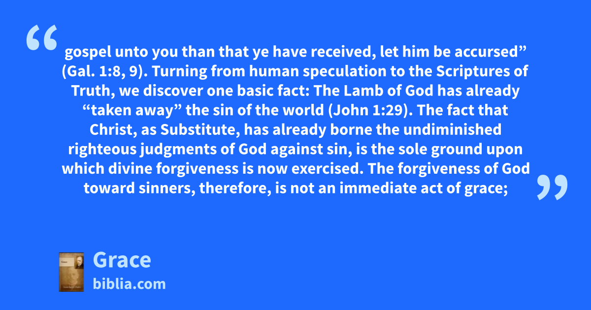 gospel unto you than that ye have received, let him be accursed” (Gal. 1:8, 9). Turning from human speculation to the Scriptures of Truth, we discover one basic fact: The Lamb of God has already “taken away” the sin of the world (John 1:29). The fact that Christ, as Substitute, has already borne the undiminished righteous judgments of God against sin, is the sole ground upon which divine forgiveness is now exercised. The forgiveness of God toward sinners, therefore, is not an immediate act of grace;