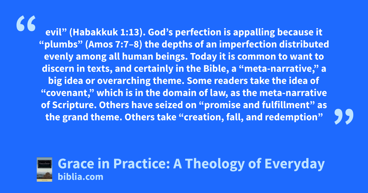 evil” (Habakkuk 1:13). God’s perfection is appalling because it “plumbs” (Amos 7:7–8) the depths of an imperfection distributed evenly among all human beings. Today it is common to want to discern in texts, and certainly in the Bible, a “meta-narrative,” a big idea or overarching theme. Some readers take the idea of “covenant,” which is in the domain of law, as the meta-narrative of Scripture. Others have seized on “promise and fulfillment” as the grand theme. Others take “creation, fall, and redemption”