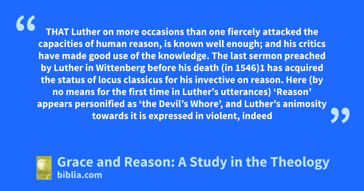 THAT Luther on more occasions than one fiercely attacked the capacities of human reason, is known well enough; and his critics have made good use of the knowledge. The last sermon preached by Luther in Wittenberg before his death (in 1546)1 has acquired the status of locus classicus for his invective on reason. Here (by no means for the first time in Luther’s utterances) ‘Reason’ appears personified as ‘the Devil’s Whore’, and Luther’s animosity towards it is expressed in violent, indeed