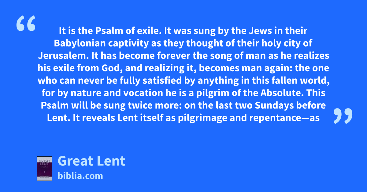 It is the Psalm of exile. It was sung by the Jews in their Babylonian captivity as they thought of their holy city of Jerusalem. It has become forever the song of man as he realizes his exile from God, and realizing it, becomes man again: the one who can never be fully satisfied by anything in this fallen world, for by nature and vocation he is a pilgrim of the Absolute. This Psalm will be sung twice more: on the last two Sundays before Lent. It reveals Lent itself as pilgrimage and repentance—as