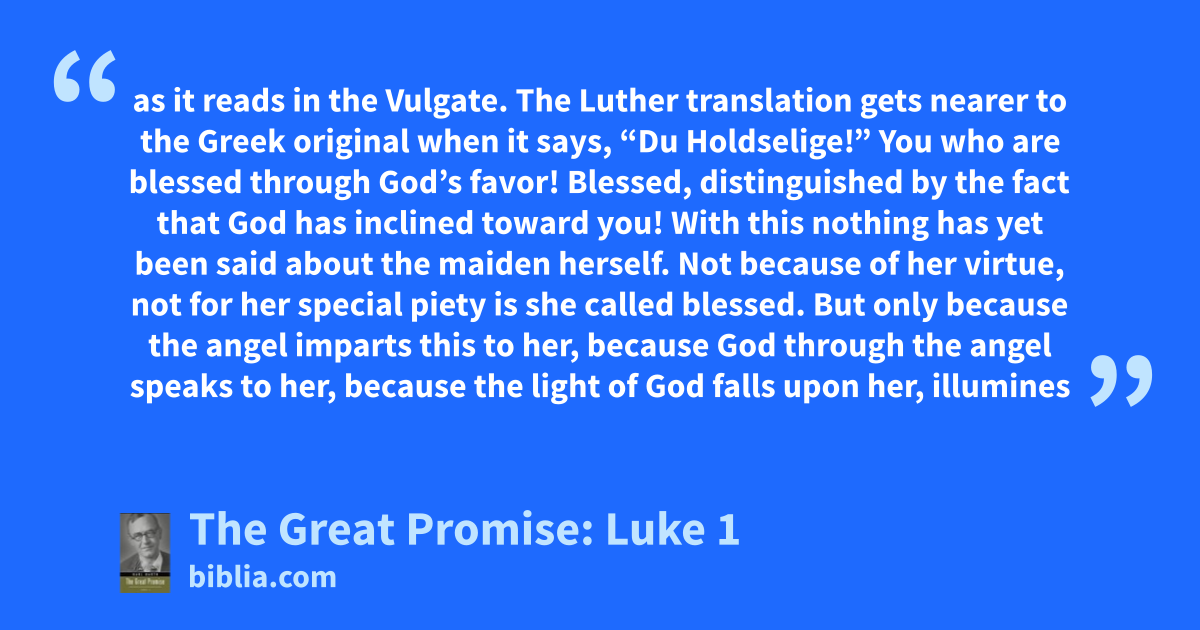 as it reads in the Vulgate. The Luther translation gets nearer to the Greek original when it says, “Du Holdselige!” You who are blessed through God’s favor! Blessed, distinguished by the fact that God has inclined toward you! With this nothing has yet been said about the maiden herself. Not because of her virtue, not for her special piety is she called blessed. But only because the angel imparts this to her, because God through the angel speaks to her, because the light of God falls upon her, illumines