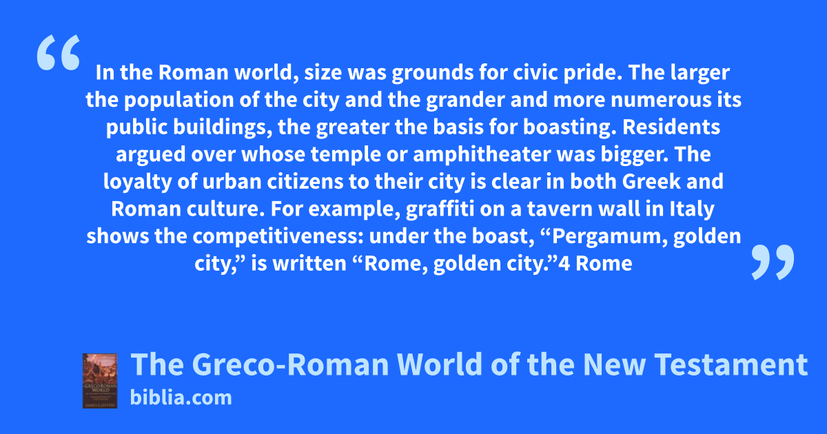 In the Roman world, size was grounds for civic pride. The larger the population of the city and the grander and more numerous its public buildings, the greater the basis for boasting. Residents argued over whose temple or amphitheater was bigger. The loyalty of urban citizens to their city is clear in both Greek and Roman culture. For example, graffiti on a tavern wall in Italy shows the competitiveness: under the boast, “Pergamum, golden city,” is written “Rome, golden city.”4 Rome