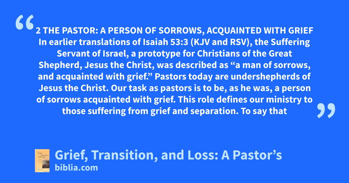 2 THE PASTOR: A PERSON OF SORROWS, ACQUAINTED WITH GRIEF In earlier translations of Isaiah 53:3 (KJV and RSV), the Suffering Servant of Israel, a prototype for Christians of the Great Shepherd, Jesus the Christ, was described as “a man of sorrows, and acquainted with grief.” Pastors today are undershepherds of Jesus the Christ. Our task as pastors is to be, as he was, a person of sorrows acquainted with grief. This role defines our ministry to those suffering from grief and separation. To say that
