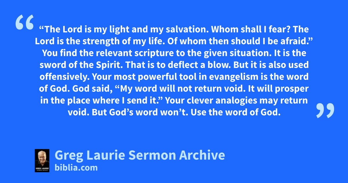 “The Lord is my light and my salvation. Whom shall I fear? The Lord is the strength of my life. Of whom then should I be afraid.” You find the relevant scripture to the given situation. It is the sword of the Spirit. That is to deflect a blow. But it is also used offensively. Your most powerful tool in evangelism is the word of God. God said, “My word will not return void. It will prosper in the place where I send it.” Your clever analogies may return void. But God’s word won’t. Use the word of God.