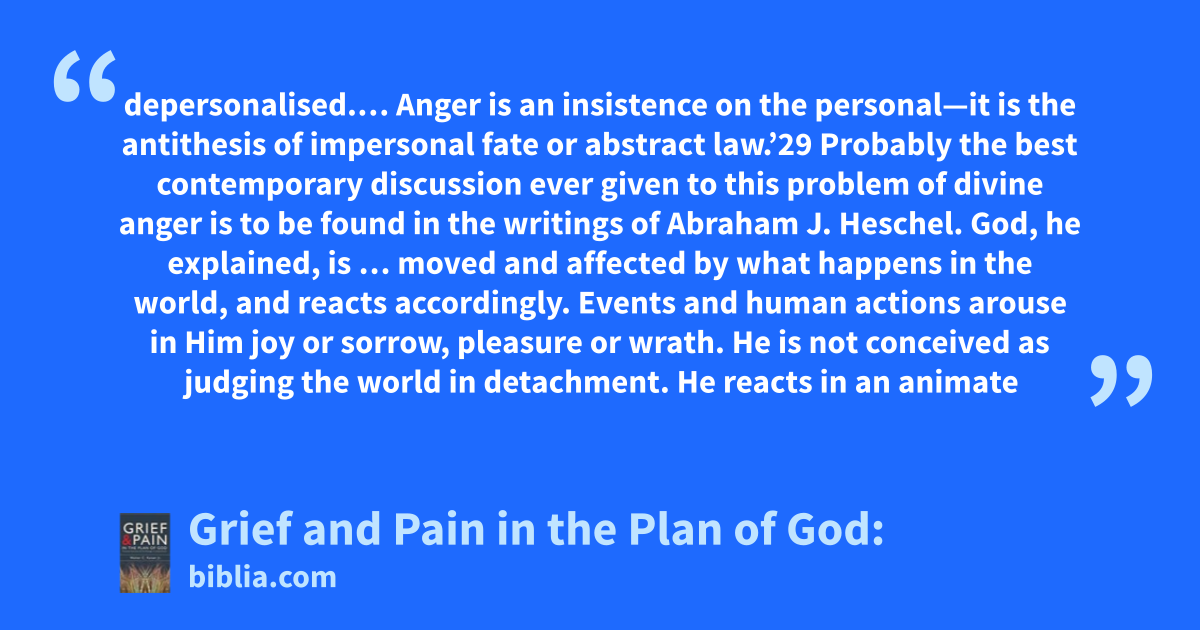 depersonalised.… Anger is an insistence on the personal—it is the antithesis of impersonal fate or abstract law.’29 Probably the best contemporary discussion ever given to this problem of divine anger is to be found in the writings of Abraham J. Heschel. God, he explained, is … moved and affected by what happens in the world, and reacts accordingly. Events and human actions arouse in Him joy or sorrow, pleasure or wrath. He is not conceived as judging the world in detachment. He reacts in an animate
