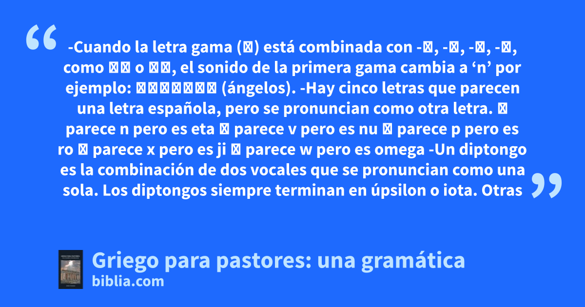 -Cuando la letra gama (γ) está combinada con -γ, -κ, -χ, -ξ, como γγ o γκ, el sonido de la primera gama cambia a ‘n’ por ejemplo: ἄγγελος (ángelos). -Hay cinco letras que parecen una letra española, pero se pronuncian como otra letra. η parece n pero es eta ν parece v pero es nu ρ parece p pero es ro χ parece x pero es ji ω parece w pero es omega -Un diptongo es la combinación de dos vocales que se pronuncian como una sola. Los diptongos siempre terminan en úpsilon o iota. Otras