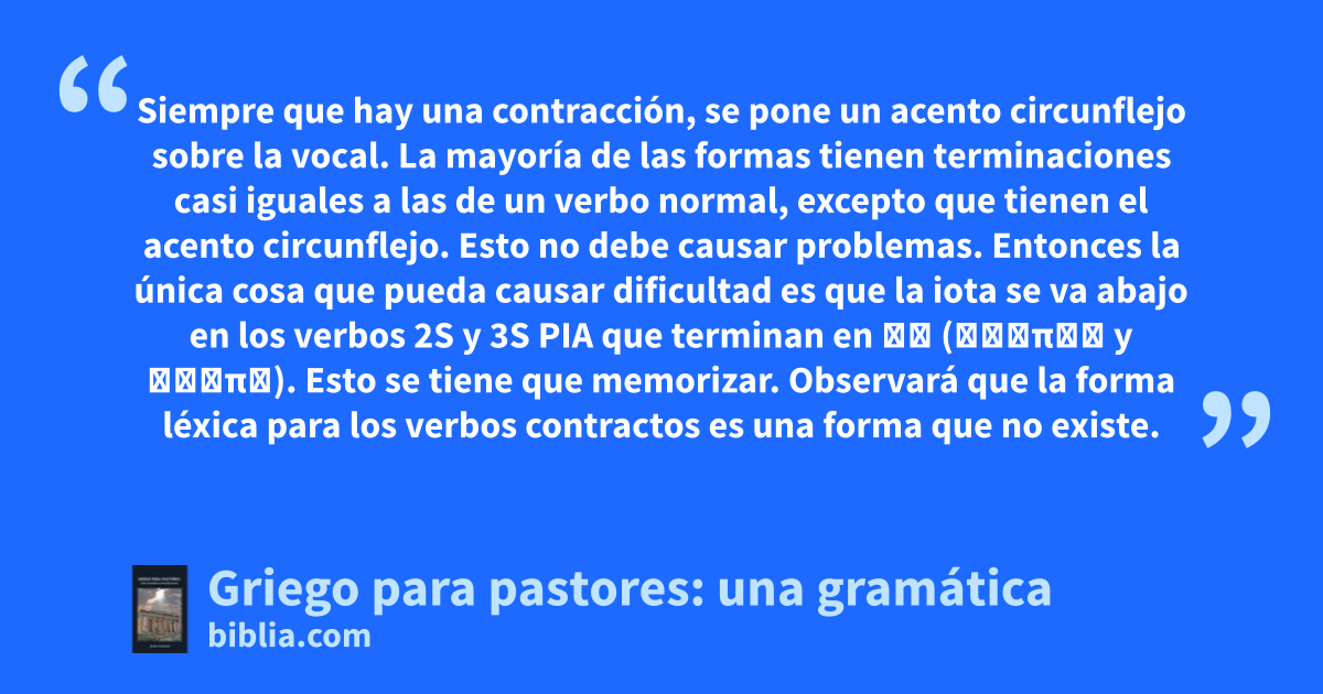 Siempre que hay una contracción, se pone un acento circunflejo sobre la vocal. La mayoría de las formas tienen terminaciones casi iguales a las de un verbo normal, excepto que tienen el acento circunflejo. Esto no debe causar problemas. Entonces la única cosa que pueda causar dificultad es que la iota se va abajo en los verbos 2S y 3S PIA que terminan en άω (ἀγαπᾷς y ἀγαπᾷ). Esto se tiene que memorizar. Observará que la forma léxica para los verbos contractos es una forma que no existe.