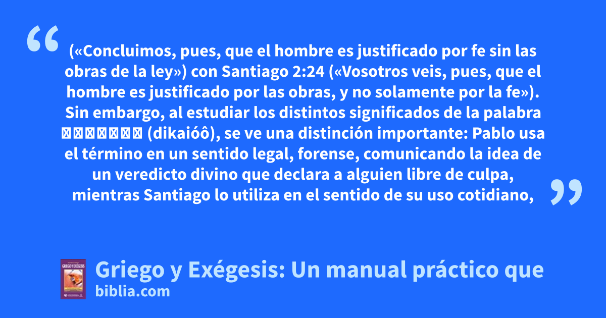 («Concluimos, pues, que el hombre es justificado por fe sin las obras de la ley») con Santiago 2:24 («Vosotros veis, pues, que el hombre es justificado por las obras, y no solamente por la fe»). Sin embargo, al estudiar los distintos significados de la palabra δικαιόω (dikaióô), se ve una distinción importante: Pablo usa el término en un sentido legal, forense, comunicando la idea de un veredicto divino que declara a alguien libre de culpa, mientras Santiago lo utiliza en el sentido de su uso cotidiano,
