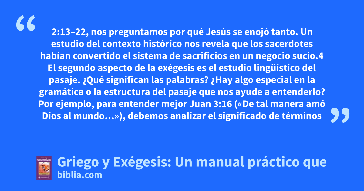 2:13–22, nos preguntamos por qué Jesús se enojó tanto. Un estudio del contexto histórico nos revela que los sacerdotes habían convertido el sistema de sacrificios en un negocio sucio.4 El segundo aspecto de la exégesis es el estudio lingüístico del pasaje. ¿Qué significan las palabras? ¿Hay algo especial en la gramática o la estructura del pasaje que nos ayude a entenderlo? Por ejemplo, para entender mejor Juan 3:16 («De tal manera amó Dios al mundo…»), debemos analizar el significado de términos