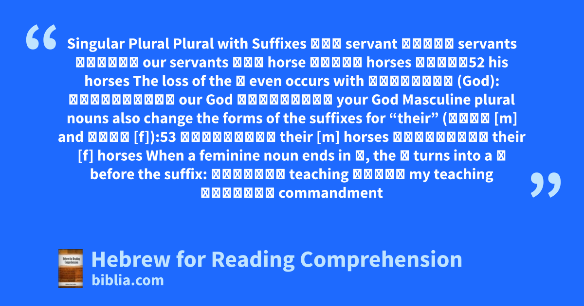 Singular Plural Plural with Suffixes עבד servant עבדים servants עבדינו our servants סוס horse סוסים horses סוסיו52 his horses The loss of the ם even occurs with אֱלֹהִים (God): אֱלֹהֵינוּ our God אֱלֹהֶיךָ your God Masculine plural nouns also change the forms of the suffixes for “their” (יהֶם [m] and יהֶן [f]):53 סוּסֵיהֶם their [m] horses סוּסֵיהֶן their [f] horses When a feminine noun ends in ה, the ה turns into a ת before the suffix: תּוֹרָה teaching תורתי my teaching מִצְוָה commandment