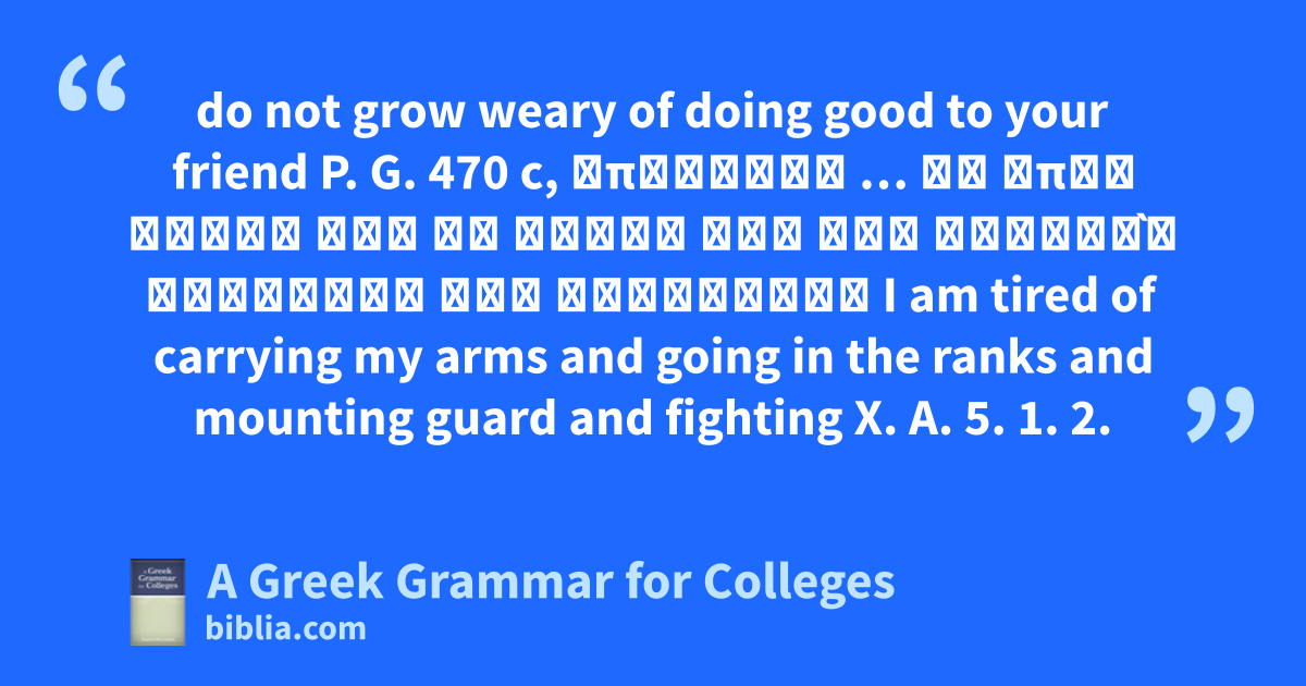 do not grow weary of doing good to your friend P. G. 470 c, ἀπείρηκα … τὰ ὅπλα φέρων καὶ ἐν τάξει ἰὼν καὶ φυλακᾱ̀ς φυλάττων καὶ μαχόμενος I am tired of carrying my arms and going in the ranks and mounting guard and fighting X. A. 5. 1. 2.