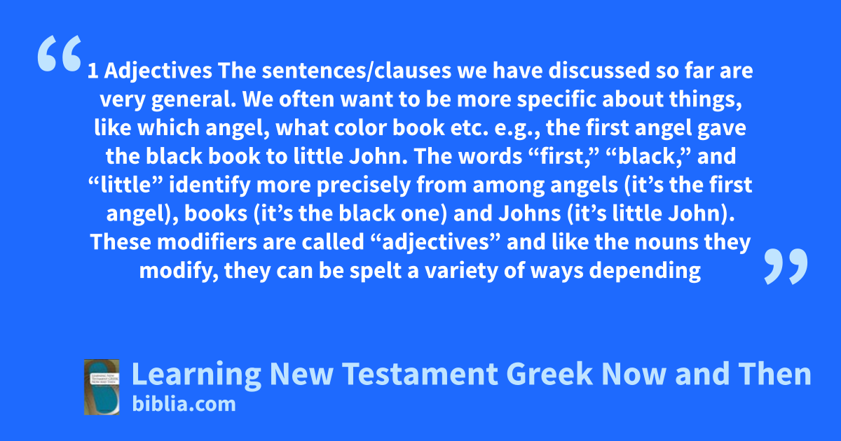 1 Adjectives The sentences/clauses we have discussed so far are very general. We often want to be more specific about things, like which angel, what color book etc. e.g., the first angel gave the black book to little John. The words “first,” “black,” and “little” identify more precisely from among angels (it’s the first angel), books (it’s the black one) and Johns (it’s little John). These modifiers are called “adjectives” and like the nouns they modify, they can be spelt a variety of ways depending