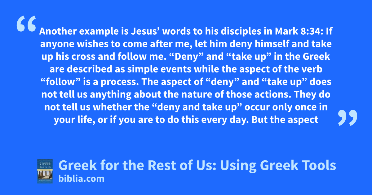 Another example is Jesus’ words to his disciples in Mark 8:34: If anyone wishes to come after me, let him deny himself and take up his cross and follow me. “Deny” and “take up” in the Greek are described as simple events while the aspect of the verb “follow” is a process. The aspect of “deny” and “take up” does not tell us anything about the nature of those actions. They do not tell us whether the “deny and take up” occur only once in your life, or if you are to do this every day. But the aspect
