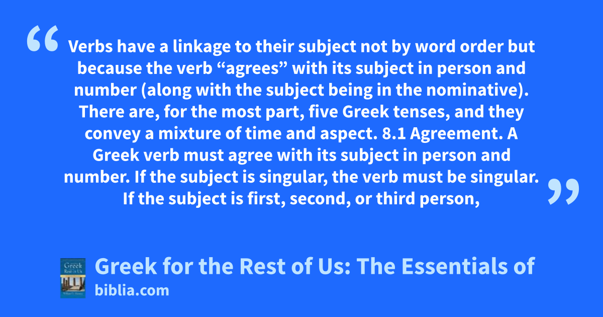 Verbs have a linkage to their subject not by word order but because the verb “agrees” with its subject in person and number (along with the subject being in the nominative). There are, for the most part, five Greek tenses, and they convey a mixture of time and aspect. 8.1 Agreement. A Greek verb must agree with its subject in person and number. If the subject is singular, the verb must be singular. If the subject is first, second, or third person,