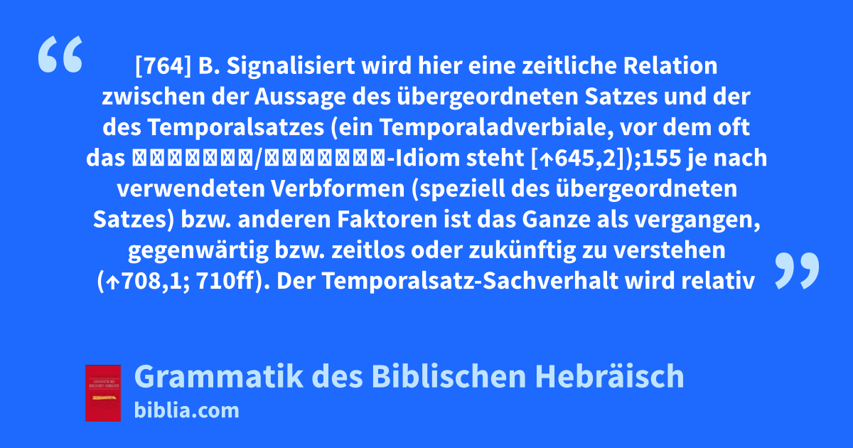 [764] B. Signalisiert wird hier eine zeitliche Relation zwischen der Aussage des übergeordneten Satzes und der des Temporalsatzes (ein Temporaladverbiale, vor dem oft das וַיְהִי/וְהָיָה-Idiom steht [↑645,2]);155 je nach verwendeten Verbformen (speziell des übergeordneten Satzes) bzw. anderen Faktoren ist das Ganze als vergangen, gegenwärtig bzw. zeitlos oder zukünftig zu verstehen (↑708,1; 710ff). Der Temporalsatz-Sachverhalt wird relativ