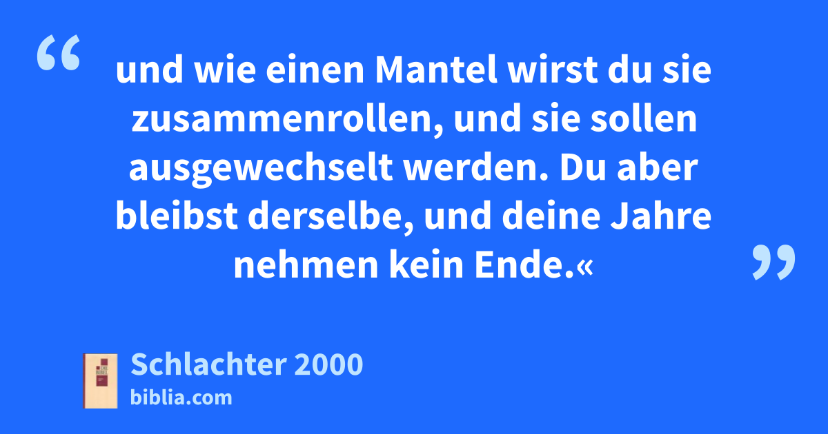 und wie einen Mantel wirst du sie zusammenrollen, und sie sollen ausgewechselt werden. Du aber bleibst derselbe, und deine Jahre nehmen kein Ende.«