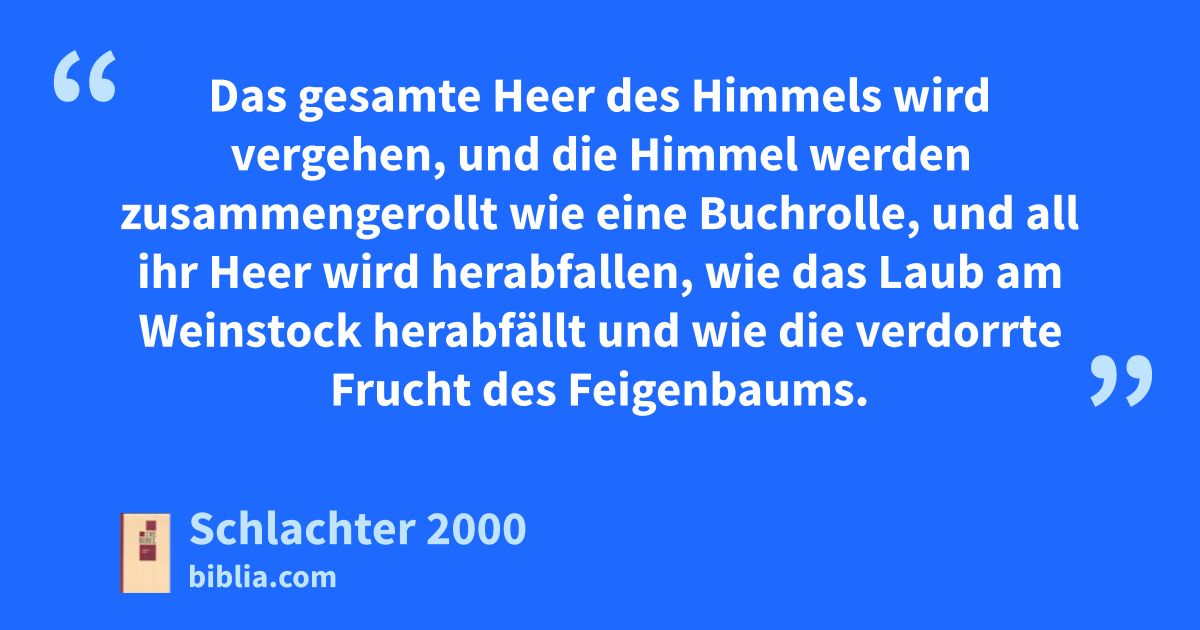 Das gesamte Heer des Himmels wird vergehen, und die Himmel werden zusammengerollt wie eine Buchrolle, und all ihr Heer wird herabfallen, wie das Laub am Weinstock herabfällt und wie die verdorrte Frucht des Feigenbaums.