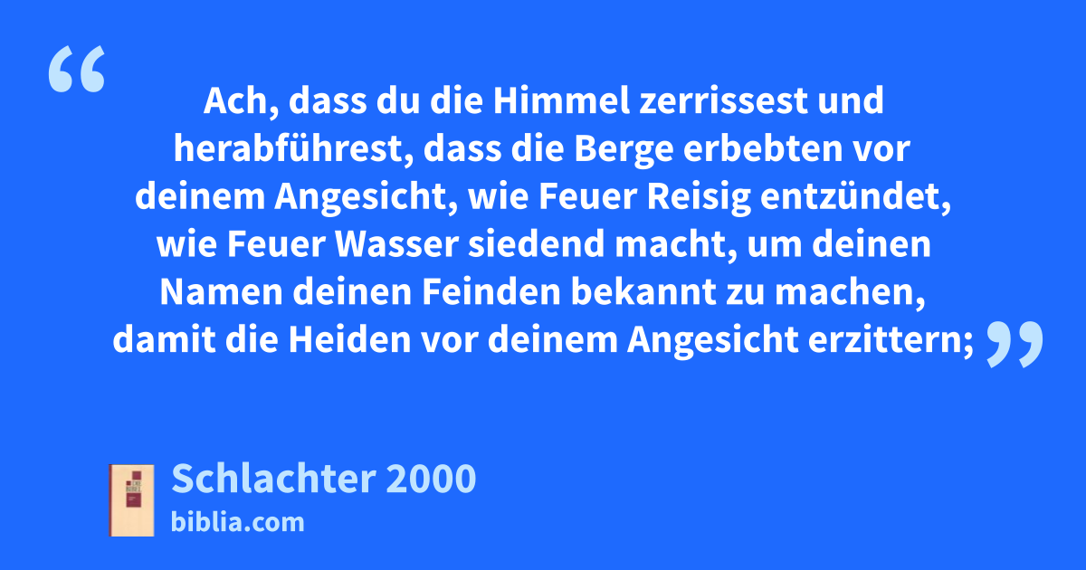 Ach, dass du die Himmel zerrissest und herabführest, dass die Berge erbebten vor deinem Angesicht, wie Feuer Reisig entzündet, wie Feuer Wasser siedend macht, um deinen Namen deinen Feinden bekannt zu machen, damit die Heiden vor deinem Angesicht erzittern;