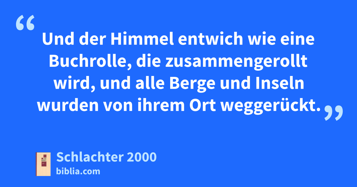 Und der Himmel entwich wie eine Buchrolle, die zusammengerollt wird, und alle Berge und Inseln wurden von ihrem Ort weggerückt.