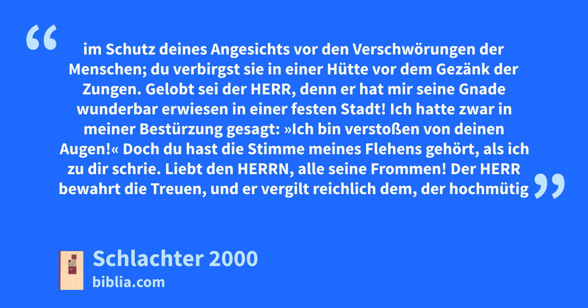 im Schutz deines Angesichts vor den Verschwörungen der Menschen; du verbirgst sie in einer Hütte vor dem Gezänk der Zungen. Gelobt sei der HERR, denn er hat mir seine Gnade wunderbar erwiesen in einer festen Stadt! Ich hatte zwar in meiner Bestürzung gesagt: »Ich bin verstoßen von deinen Augen!« Doch du hast die Stimme meines Flehens gehört, als ich zu dir schrie. Liebt den HERRN, alle seine Frommen! Der HERR bewahrt die Treuen, und er vergilt reichlich dem, der hochmütig