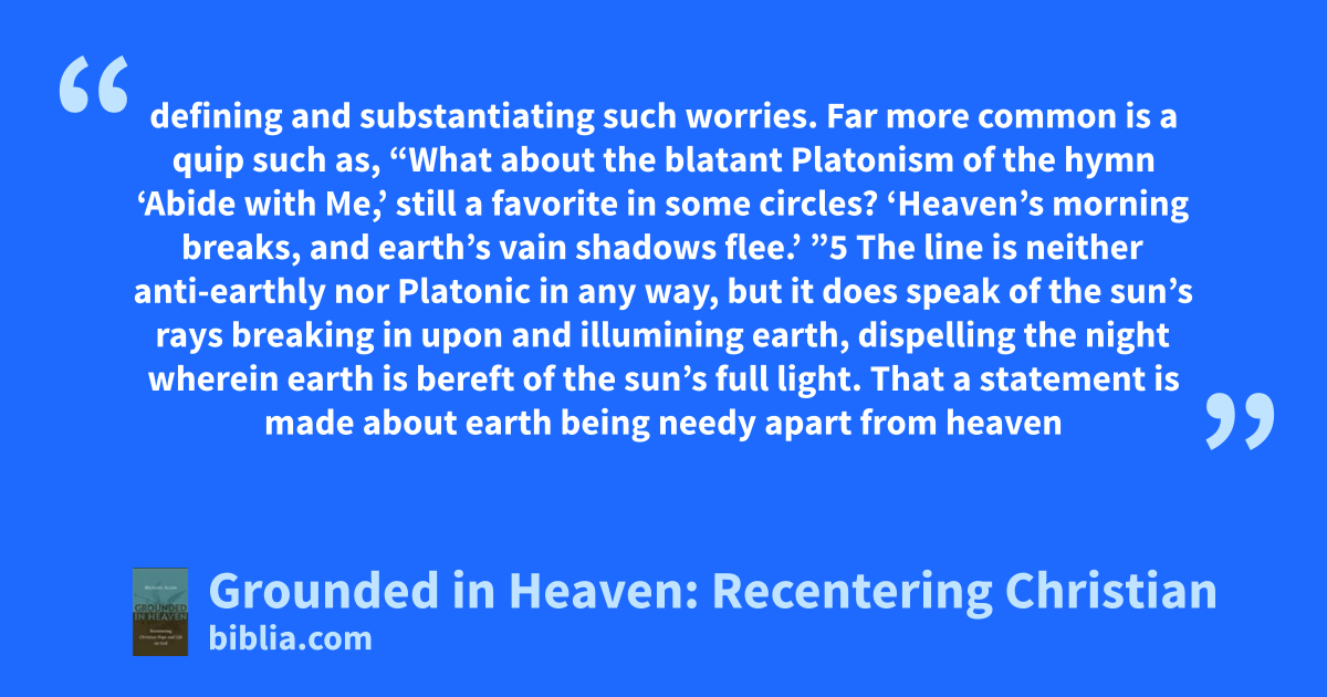defining and substantiating such worries. Far more common is a quip such as, “What about the blatant Platonism of the hymn ‘Abide with Me,’ still a favorite in some circles? ‘Heaven’s morning breaks, and earth’s vain shadows flee.’ ”5 The line is neither anti-earthly nor Platonic in any way, but it does speak of the sun’s rays breaking in upon and illumining earth, dispelling the night wherein earth is bereft of the sun’s full light. That a statement is made about earth being needy apart from heaven