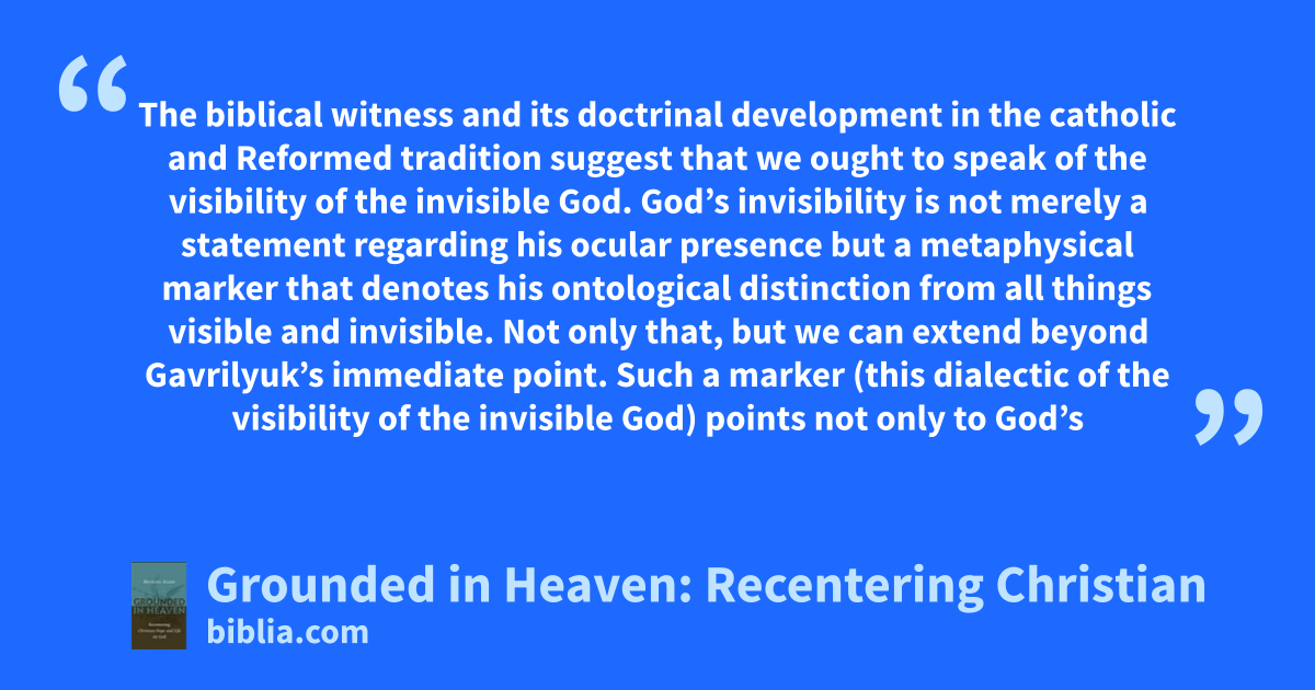 The biblical witness and its doctrinal development in the catholic and Reformed tradition suggest that we ought to speak of the visibility of the invisible God. God’s invisibility is not merely a statement regarding his ocular presence but a metaphysical marker that denotes his ontological distinction from all things visible and invisible. Not only that, but we can extend beyond Gavrilyuk’s immediate point. Such a marker (this dialectic of the visibility of the invisible God) points not only to God’s