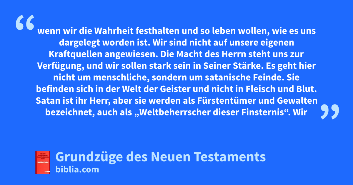 wenn wir die Wahrheit festhalten und so leben wollen, wie es uns dargelegt worden ist. Wir sind nicht auf unsere eigenen Kraftquellen angewiesen. Die Macht des Herrn steht uns zur Verfügung, und wir sollen stark sein in Seiner Stärke. Es geht hier nicht um menschliche, sondern um satanische Feinde. Sie befinden sich in der Welt der Geister und nicht in Fleisch und Blut. Satan ist ihr Herr, aber sie werden als Fürstentümer und Gewalten bezeichnet, auch als „Weltbeherrscher dieser Finsternis“. Wir