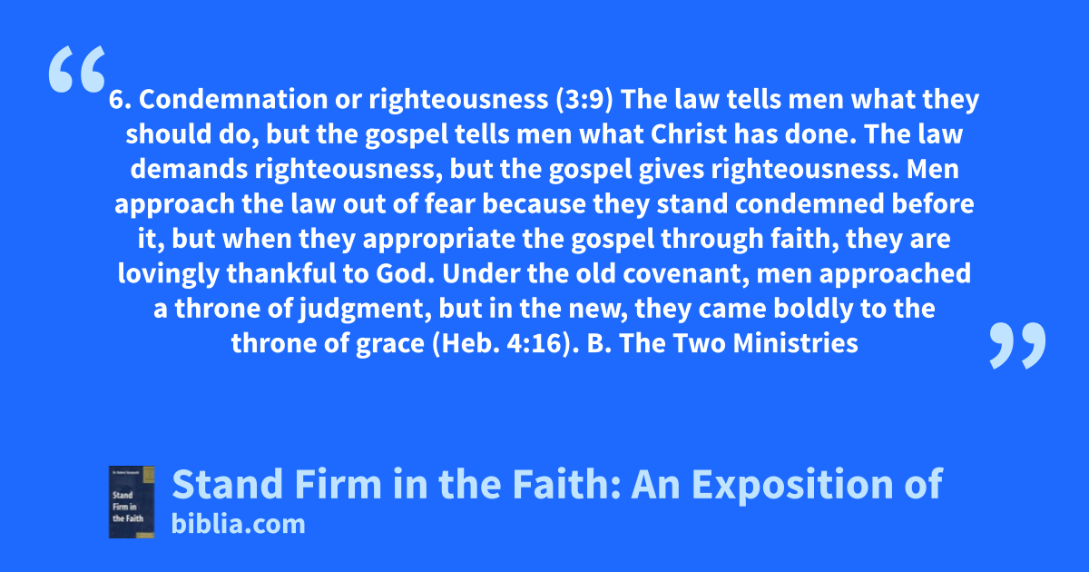 6. Condemnation or righteousness (3:9) The law tells men what they should do, but the gospel tells men what Christ has done. The law demands righteousness, but the gospel gives righteousness. Men approach the law out of fear because they stand condemned before it, but when they appropriate the gospel through faith, they are lovingly thankful to God. Under the old covenant, men approached a throne of judgment, but in the new, they came boldly to the throne of grace (Heb. 4:16). B. The Two Ministries
