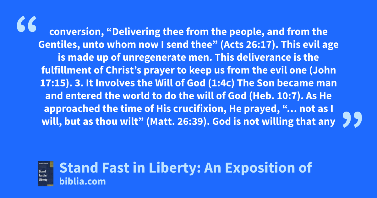 conversion, “Delivering thee from the people, and from the Gentiles, unto whom now I send thee” (Acts 26:17). This evil age is made up of unregenerate men. This deliverance is the fulfillment of Christ’s prayer to keep us from the evil one (John 17:15). 3. It Involves the Will of God (1:4c) The Son became man and entered the world to do the will of God (Heb. 10:7). As He approached the time of His crucifixion, He prayed, “… not as I will, but as thou wilt” (Matt. 26:39). God is not willing that any