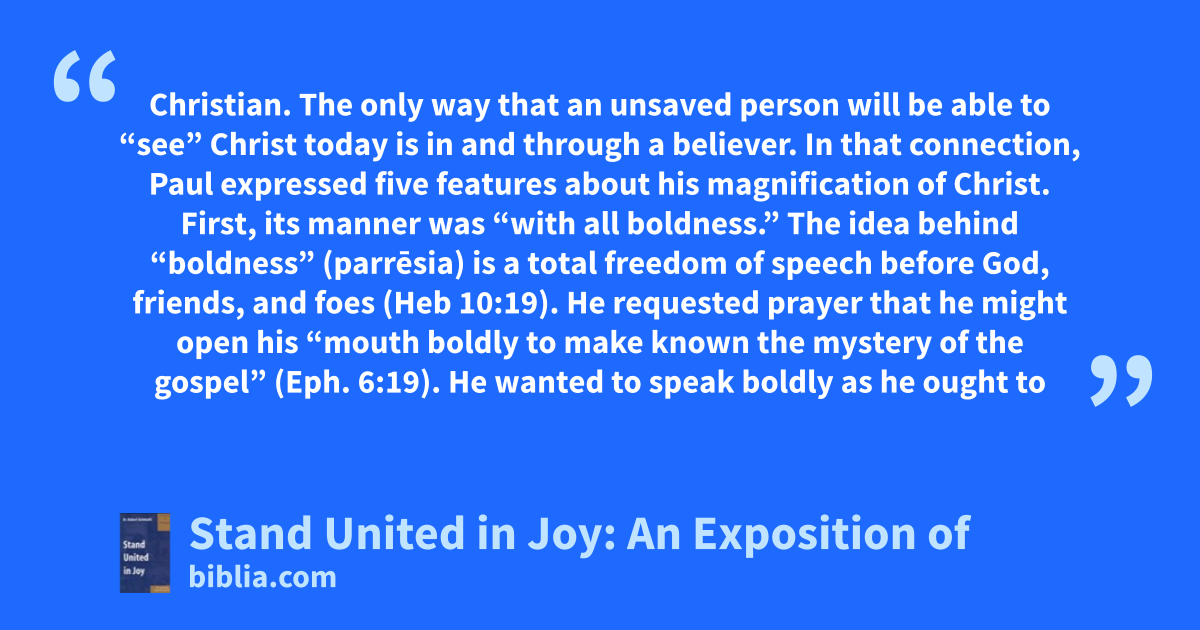 Christian. The only way that an unsaved person will be able to “see” Christ today is in and through a believer. In that connection, Paul expressed five features about his magnification of Christ. First, its manner was “with all boldness.” The idea behind “boldness” (parrēsia) is a total freedom of speech before God, friends, and foes (Heb 10:19). He requested prayer that he might open his “mouth boldly to make known the mystery of the gospel” (Eph. 6:19). He wanted to speak boldly as he ought to
